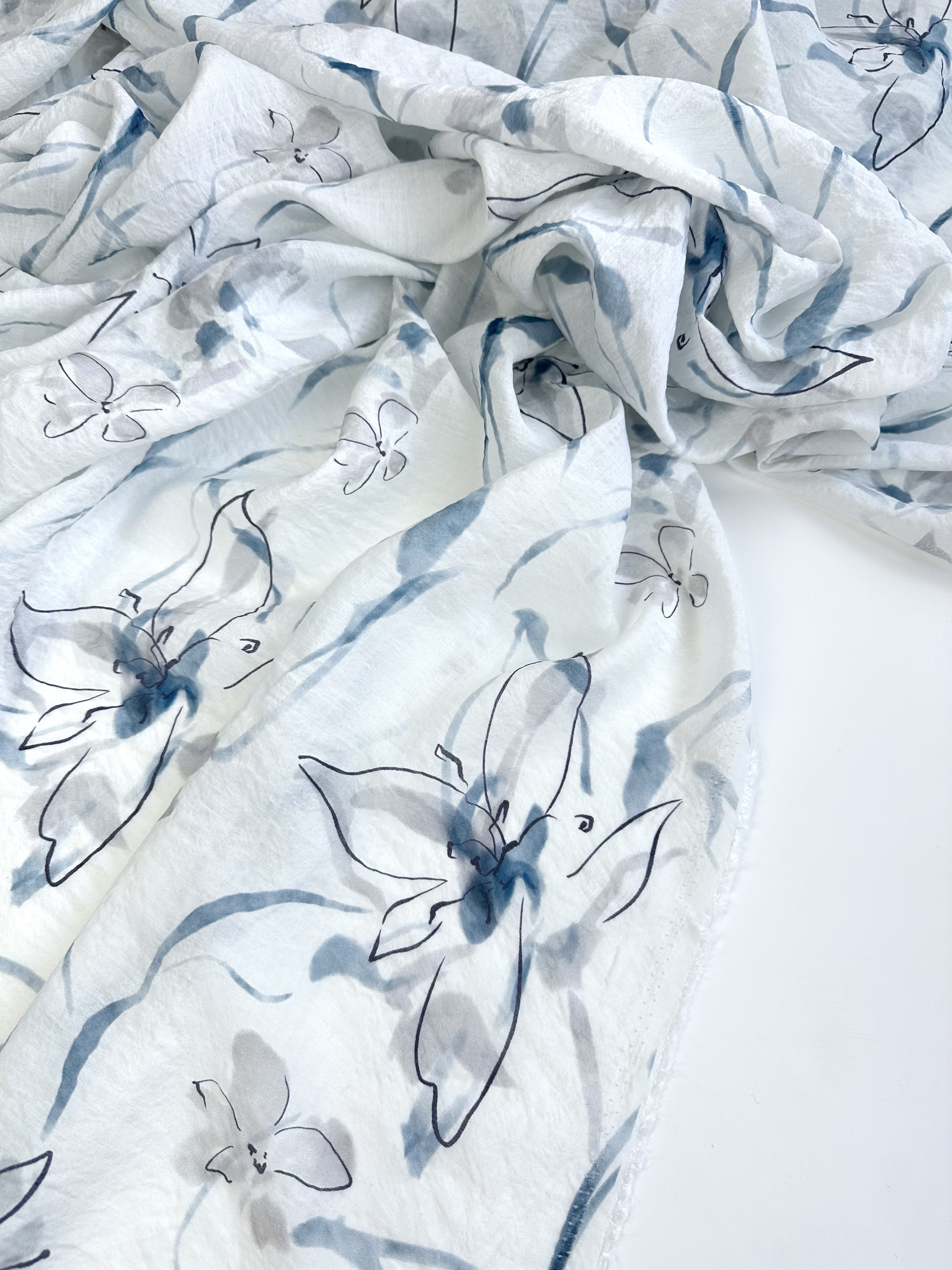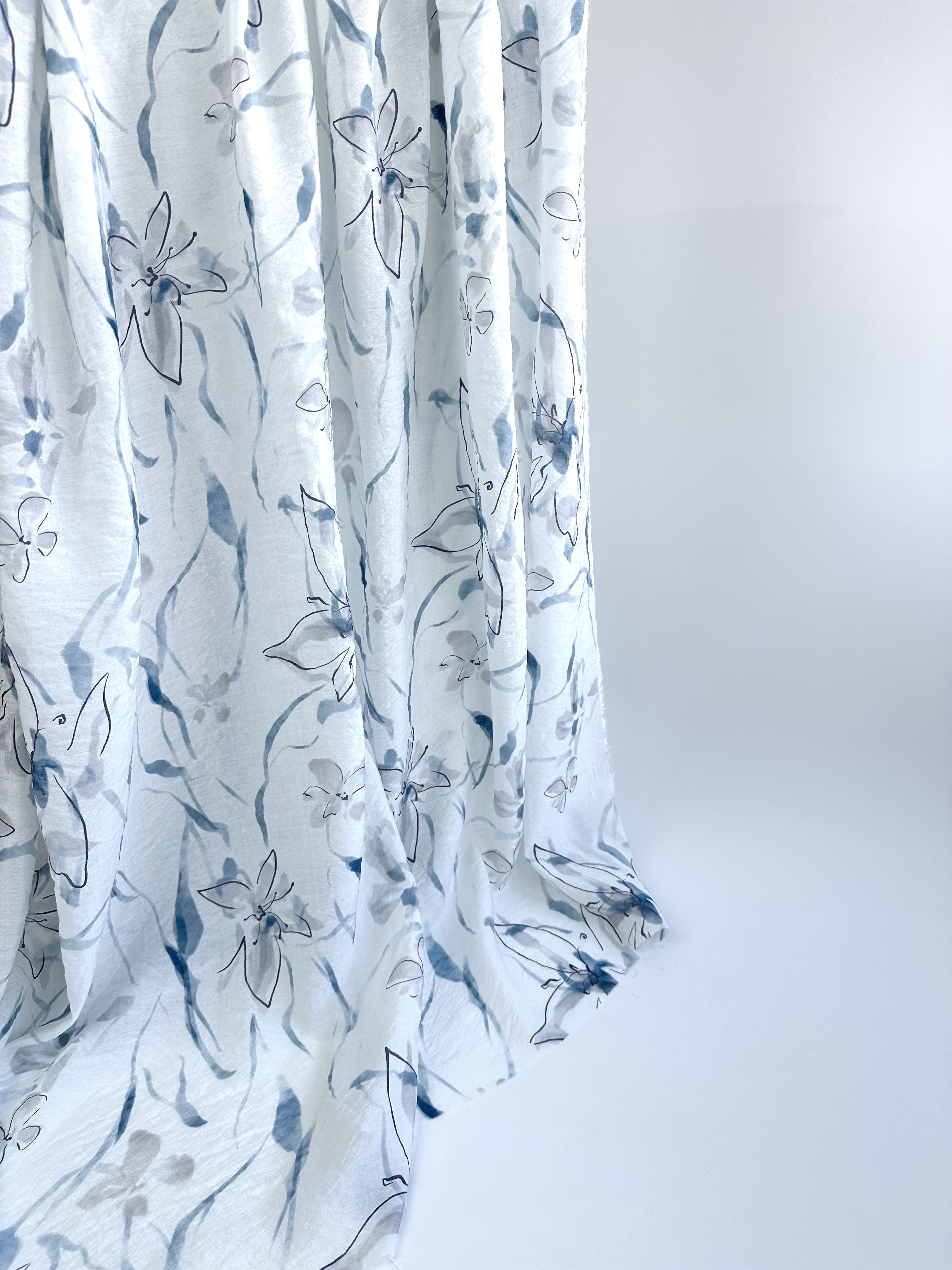 Рисунок нежный, контурный цветок лилии, серые и голубовато джинсовые акварельные разводы.