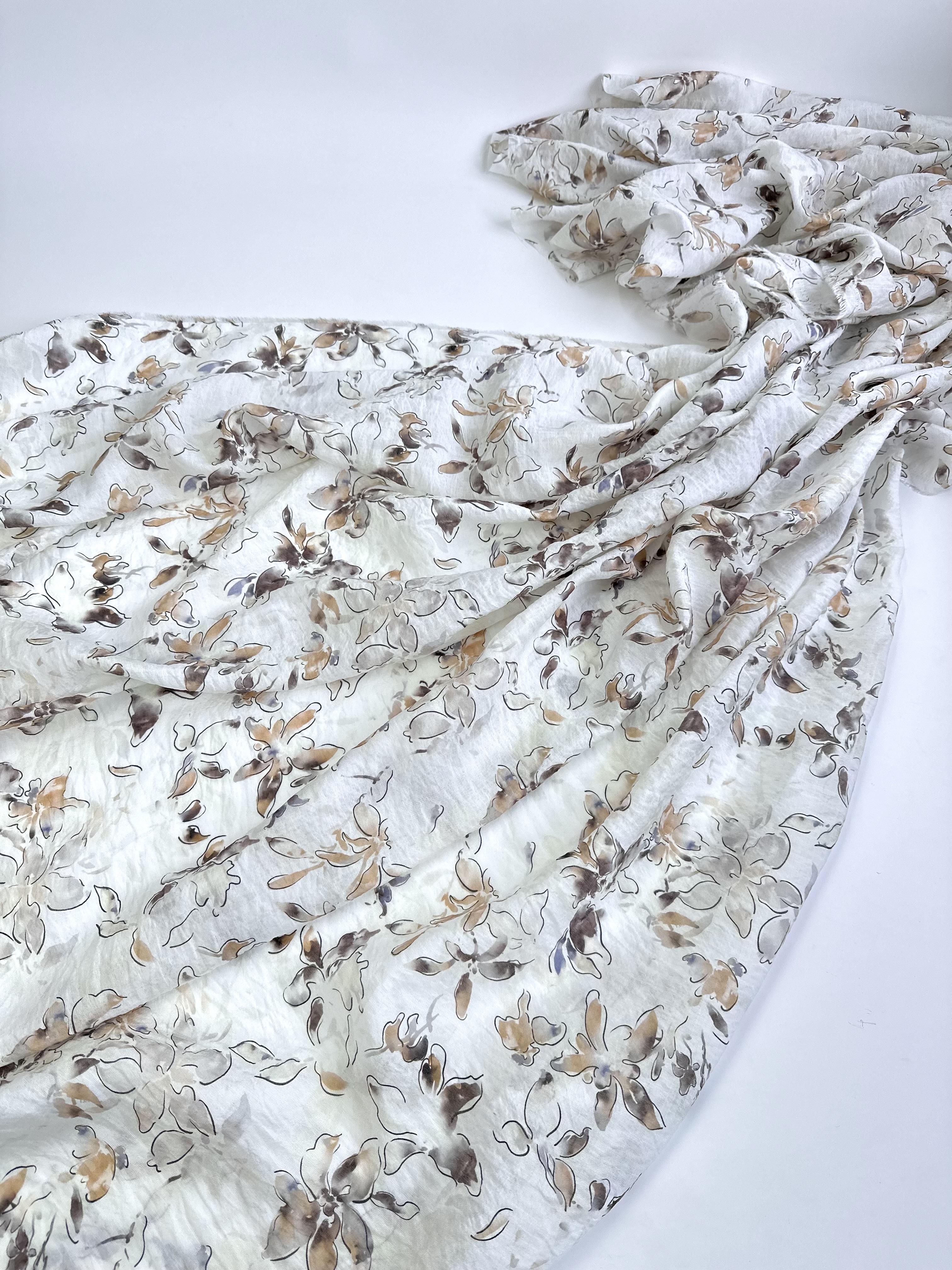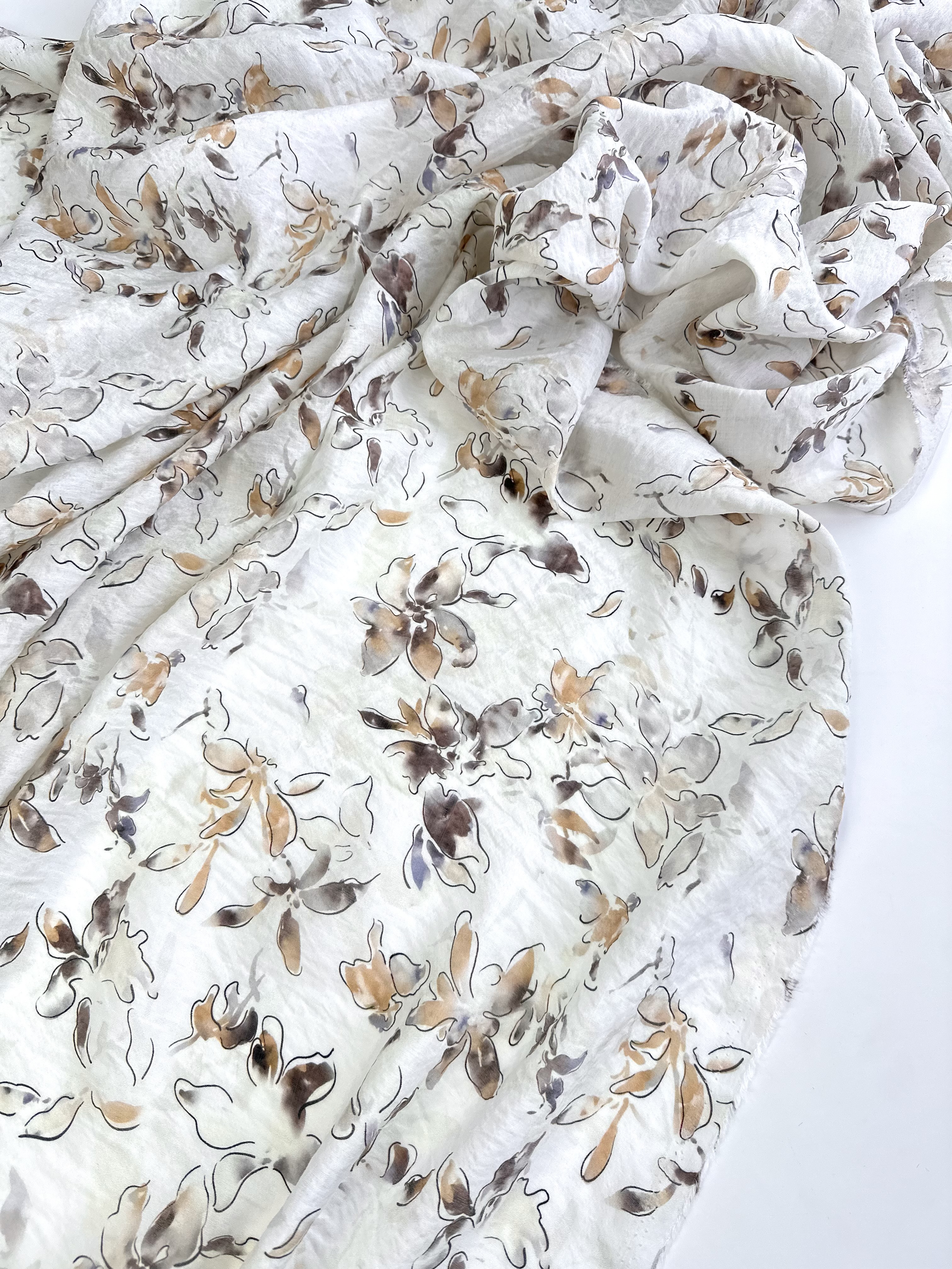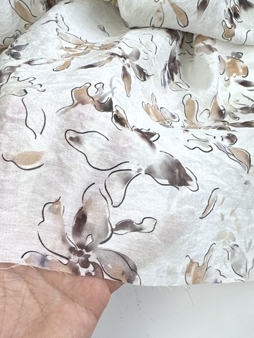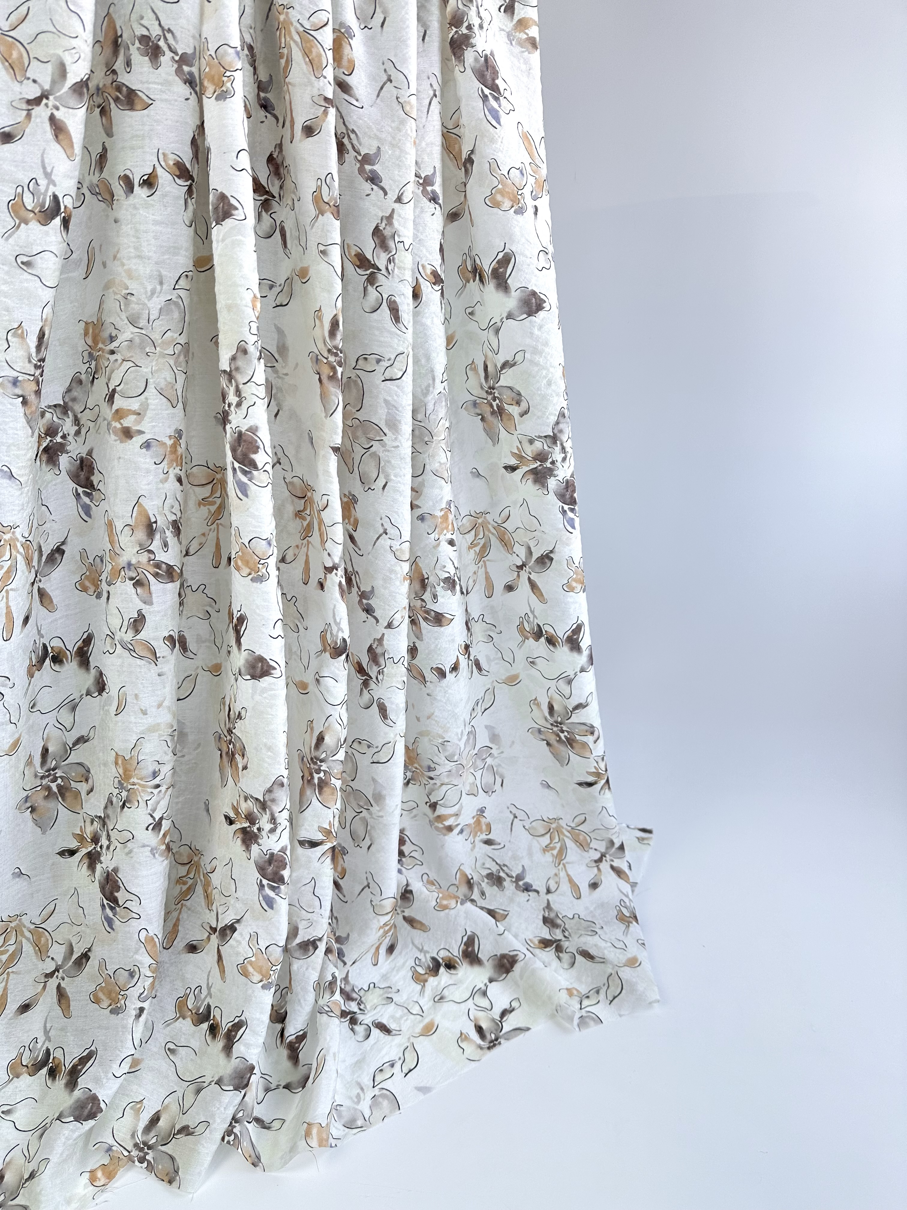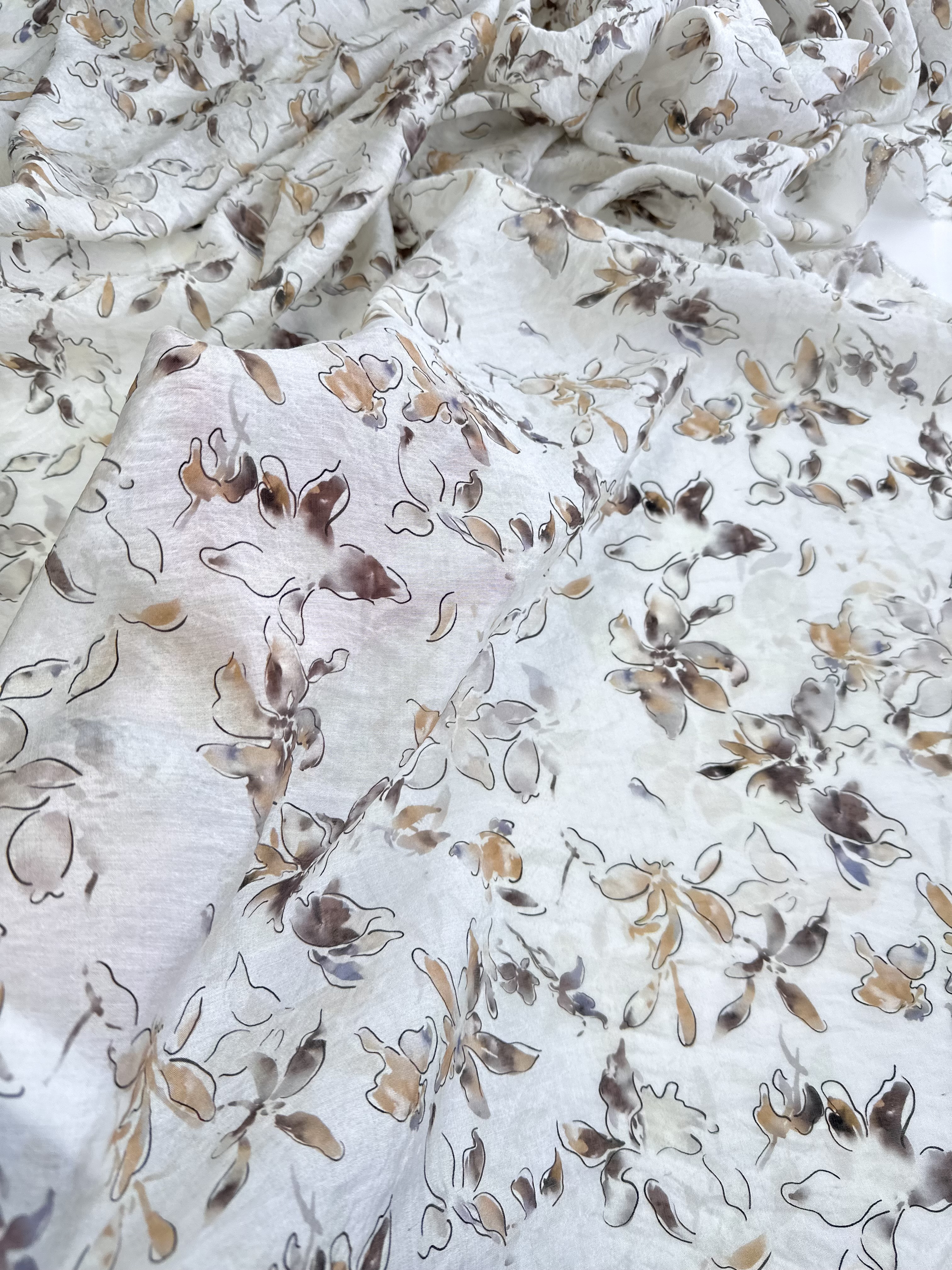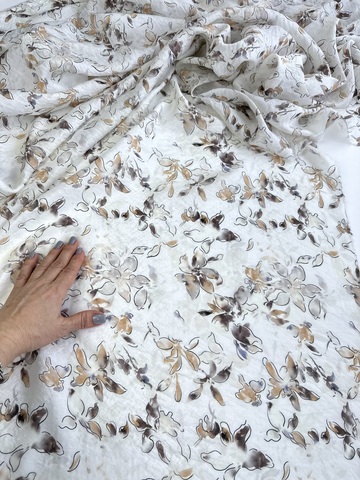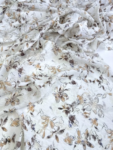 Рисунок нежный, контурные цветы, акварельные коричневые, песочные, сероватые, лавандовые мазки и разводы.