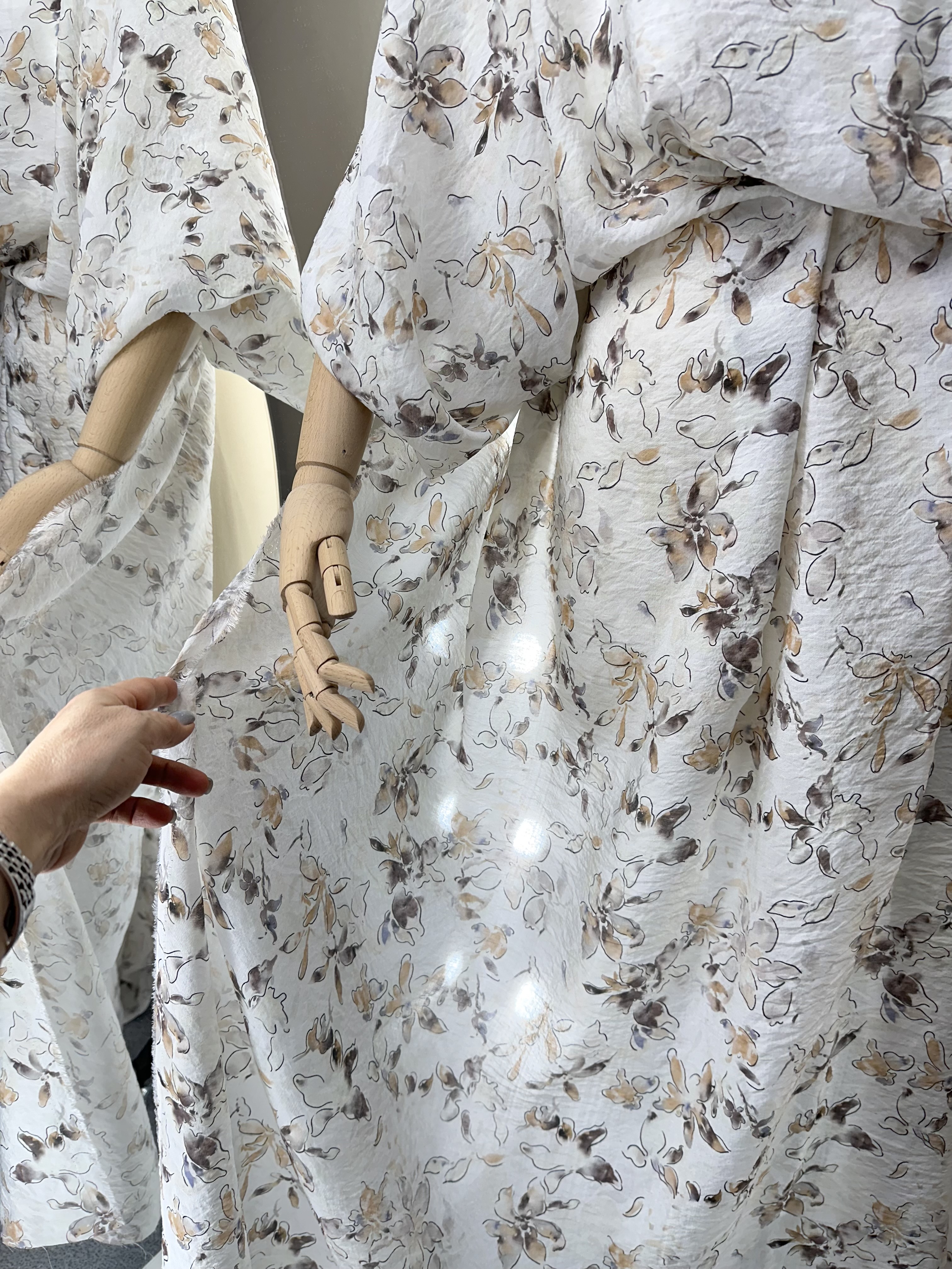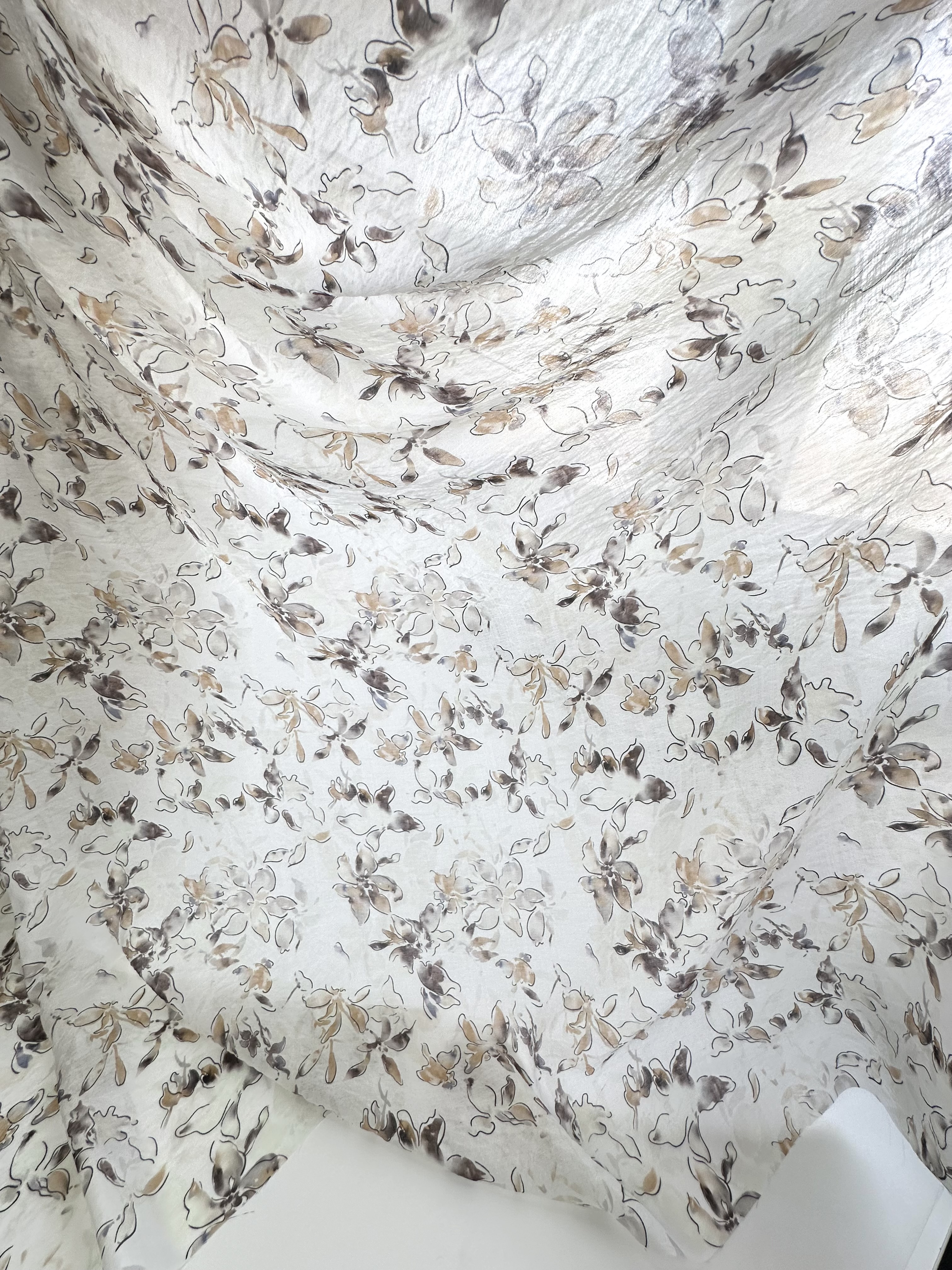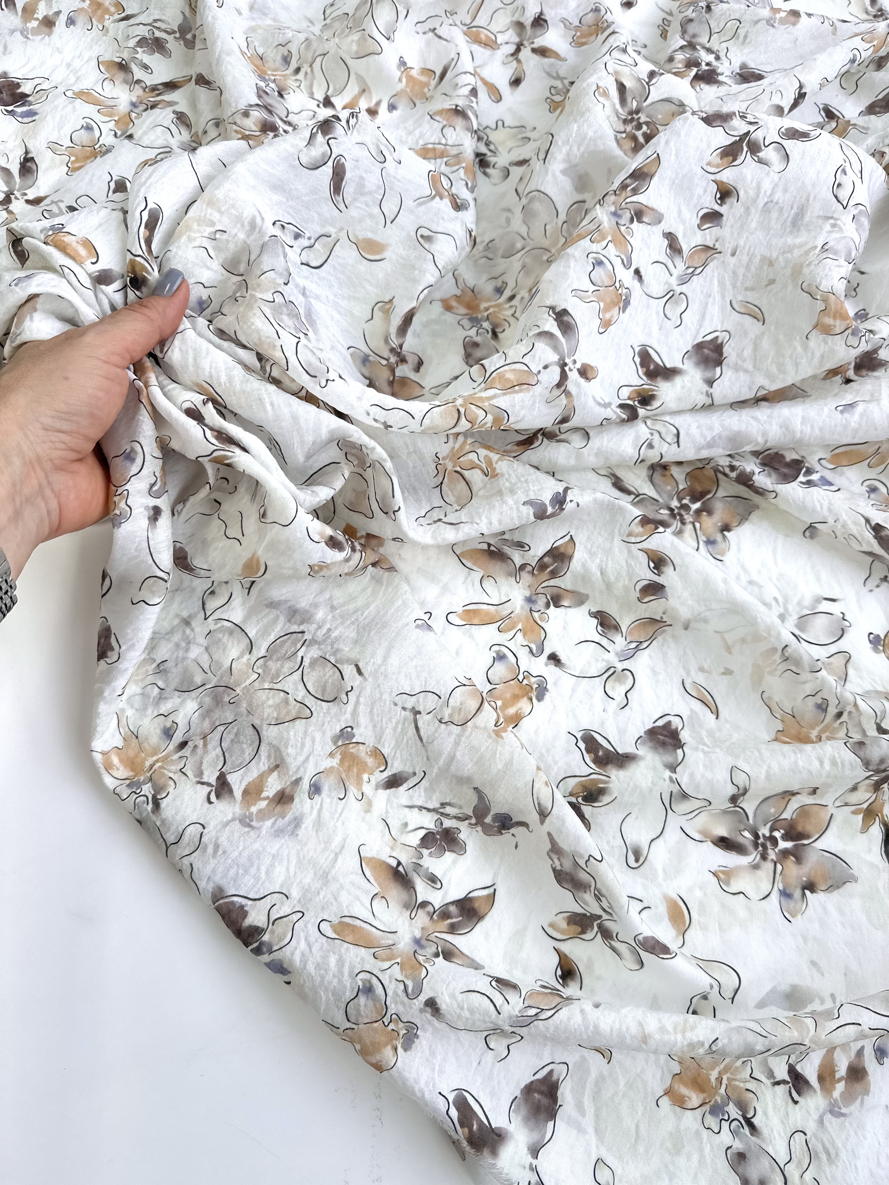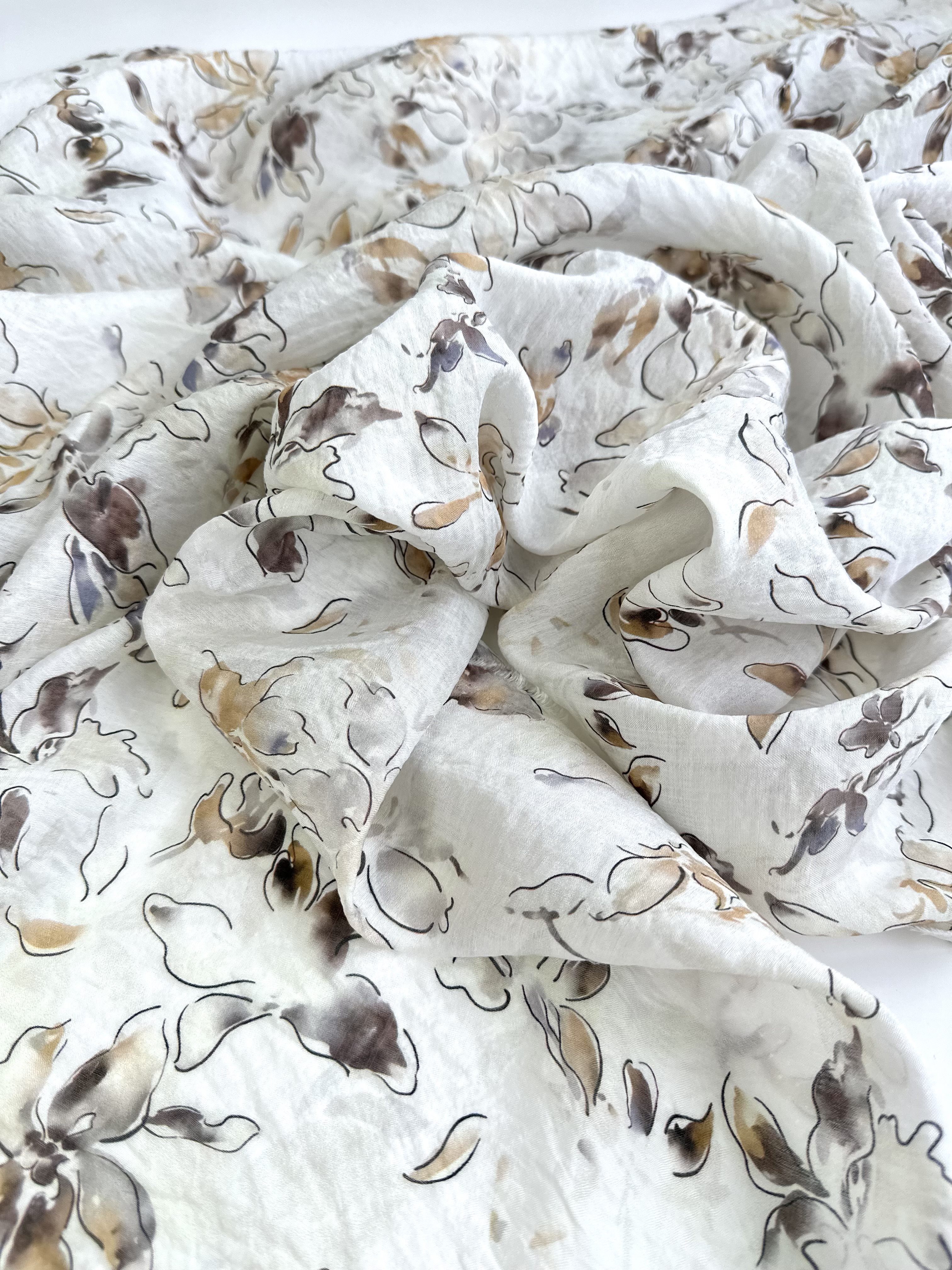 Рисунок нежный, контурные цветы, акварельные коричневые, песочные, сероватые, лавандовые мазки и разводы.